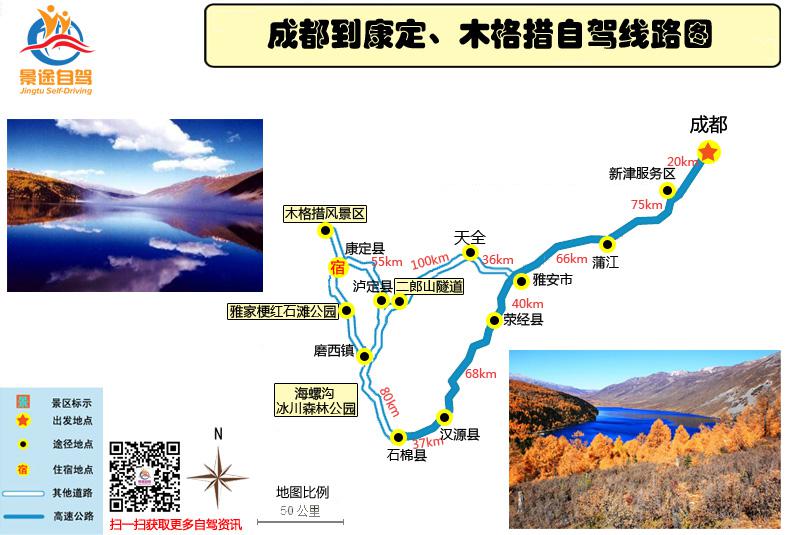 木格措风景区:现更名为康定情歌风景区,位于康定县城东北,距县城26公里,海拔2900-3800米,面积500平方公里。木格措又叫野人海,木格措海,有"小九寨"之称,是川西北海拔2000为以上地区最大的高山湖泊 。景区由杜鹃峡、赛马坪、七色海、药池森林、温泉、雪峰、叠瀑、奇山异石组成景区独特秀丽的景色。木格措周围有折多山37座雪峰组成的山、水、气、声景区,著名的景观有"石虎卧山"、"木格潮汐"、"叠瀑飞泉"等。称为药泉的沸泉群在70余平方米范围内有近100个泉眼,水温高达90度,含有多种人体有益的元素,不同的泉眼对治疗眼疾、胃病、风湿等病症具有不同的疗效