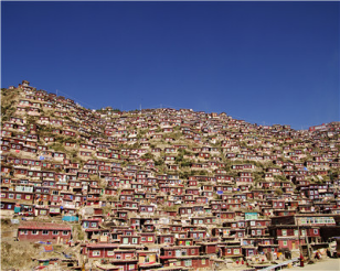 早餐后出发,前往色达,经观音桥镇、翁达镇,一路峡谷风光,下午行车崇山峻岭,拐个弯眼前一亮,让你有不真实的震撼是因为这里有一条山沟叫喇荣沟,顺沟上行数里,蔚蓝苍穹之下,银岭碧草之间,数千间赫红色的木屋,如众星拱月般簇拥着几座金碧辉煌的大殿--它就是藏于深山中的喇荣寺五明佛学院,也称色达佛学院。