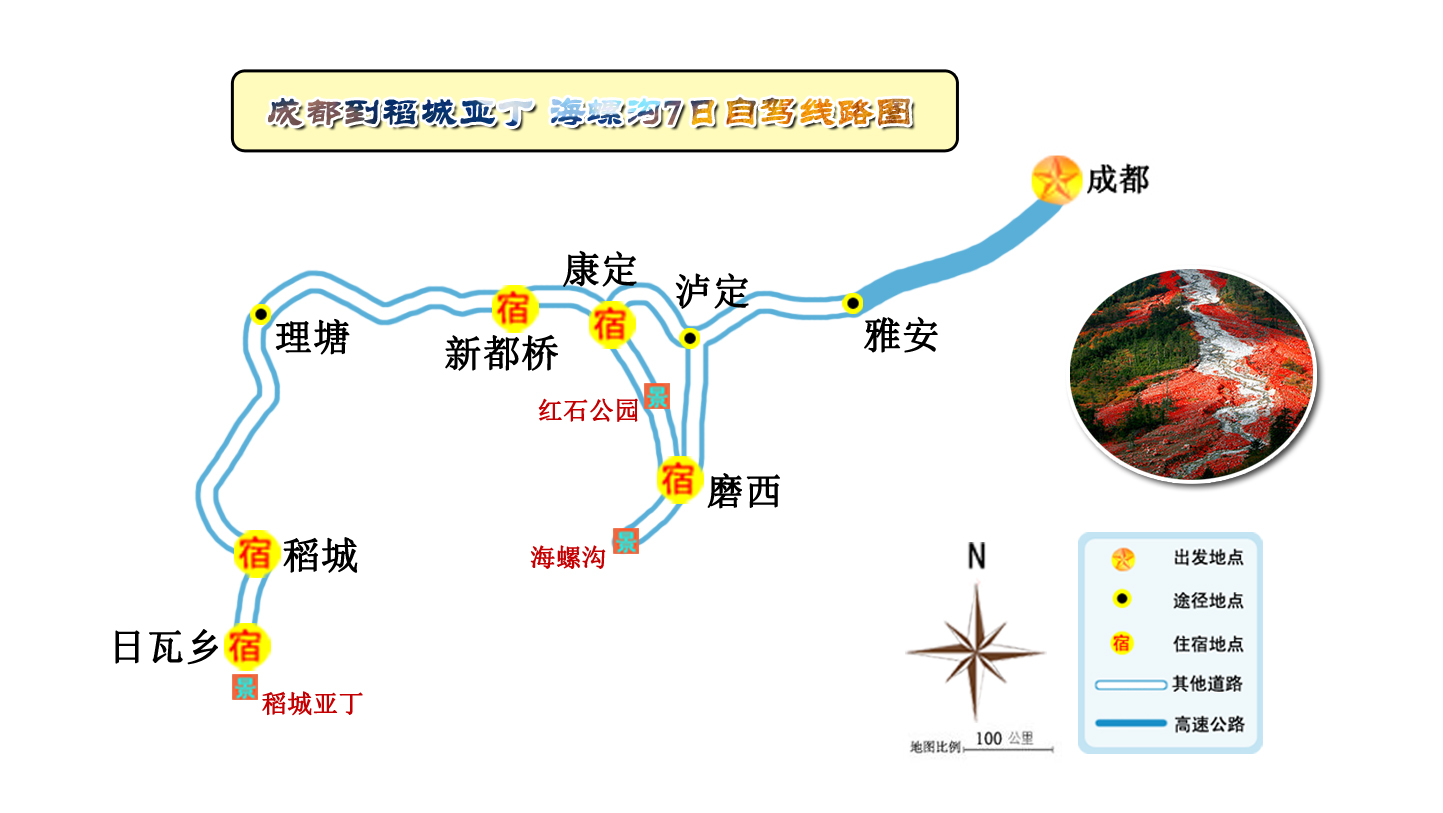 稻城—150km—理塘—130km—雅江—76km—新都桥—79km—康定 (全程约435公里)