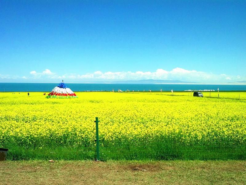 3、7-8月的青海湖更是热闹非凡,五彩缤纷的野花,整齐如画的农田,碧波万顷 水天一色的青海湖