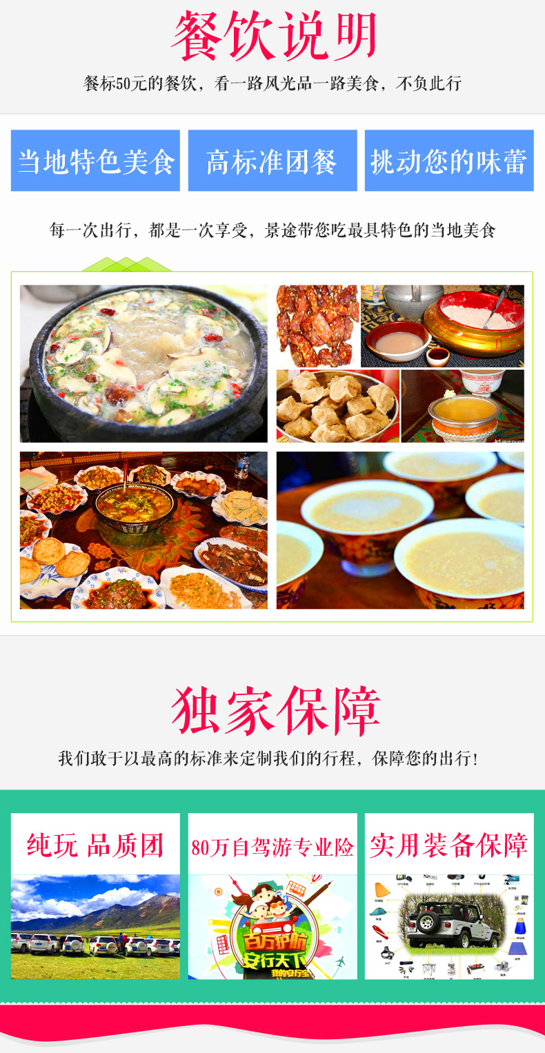 5、【个人食品】:因长时间行车,途中车辆负荷较重,可能会遇到汽车抛锚并影响行程的情况,请您做好心理准备、出发前请自备一些矿泉水、饼干、水果之类的食品,以备不能正常用餐时使用。