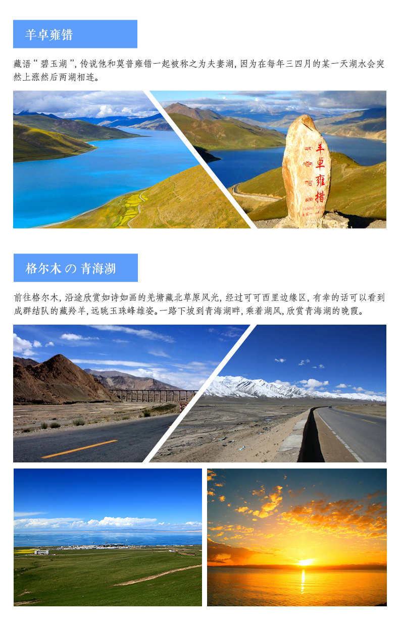 2、门票:米堆冰川50元,雅鲁藏布江大峡谷290元,布达拉宫门票200元(不含预约手续费),羊卓雍湖40元,纳木错门票130元,茶卡盐湖景区门票70元,观光车50元。(如因客观原因没有到达包含景点游览或全团客人放弃不到包含景点的门票,作退该景点门票处理,但因个人原因不到景点游览,则不退还该景点门票)。